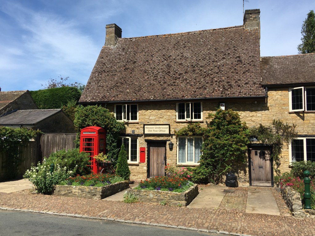 Turn west and towards Weston Underwood, where everything is built from the distinctive yellow Northamptonshire limestone. In particular look out for the pretty old post office on the right with it’s its in character props.