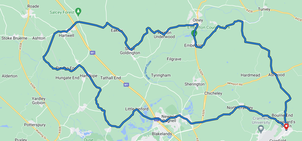 One of the nicest things about starting your ride in Cranfield is that it’s possible to head out in any direction and find a route that avoids the busy roads and heavy traffic. This ride leads out to the north and west. It is a ride with lots of potential for variation and if you want to extend it look to go on to Stoke Bruerne or even further out towards Towcester for more good riding.